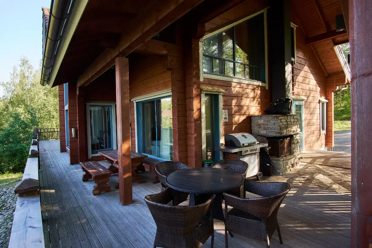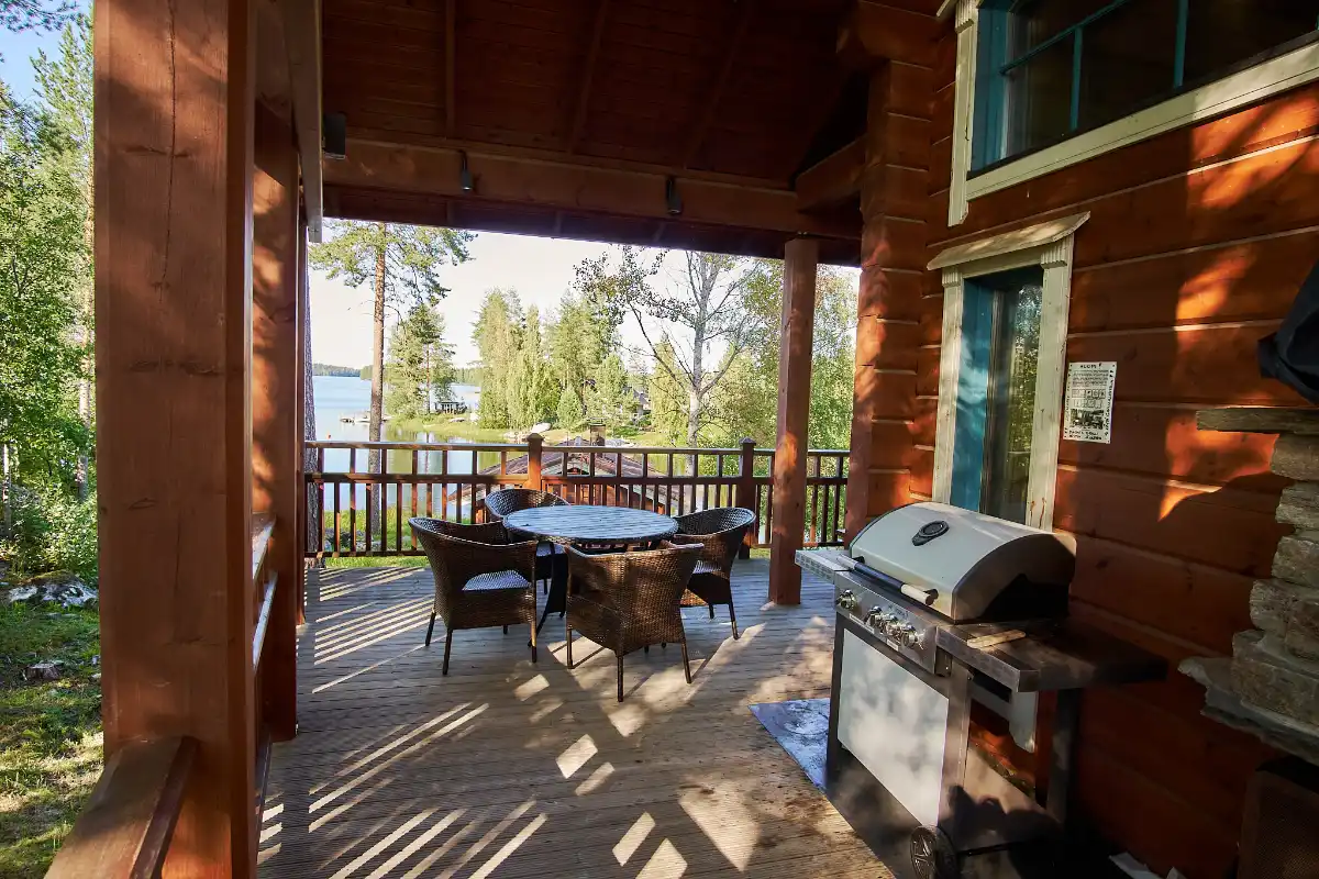 Kerroksesta on käynti suurelle terassille, jossa on pöytiä ja tuoleja ruokailuun. Terassilta löytyvät myös kaasugrilli, takka sekä näkymä Syvärin järvelle.